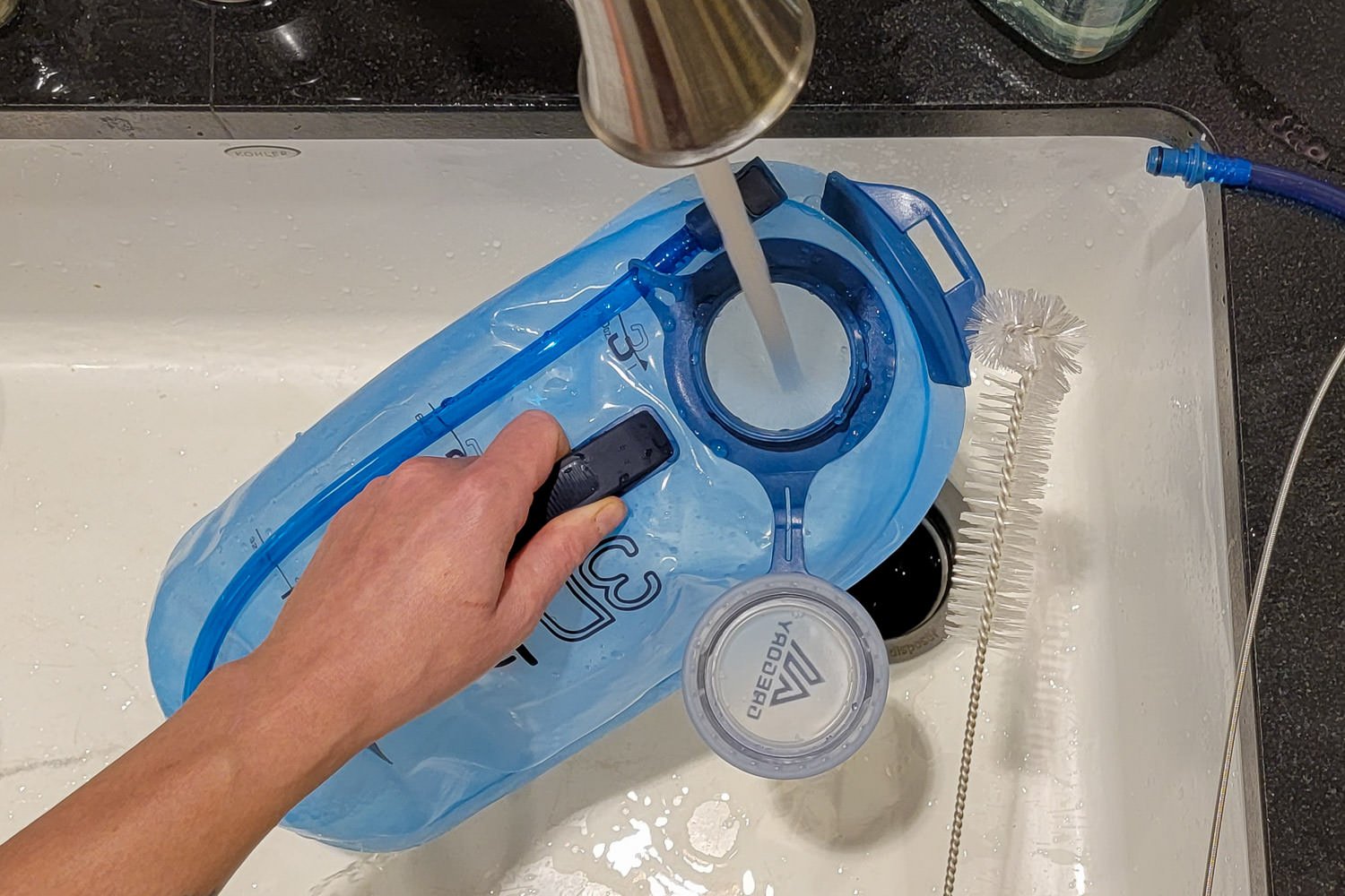 If funky tastes or odors develop, try filling your reservoir with water, adding a tablespoon each of bleach and baking soda, and letting it sit overnight. Rinse well and air dry as usual. A cleaning kit (CamelBak / Gregory) specifically made for your hydration reservoir will make maintenance even easier.
