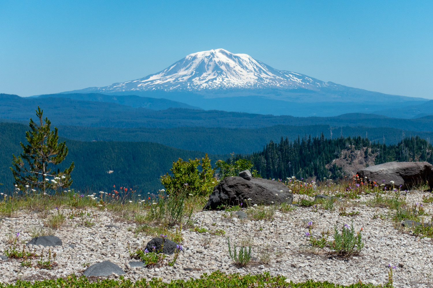 - Views of Mount Rainier, Adams and Hood.