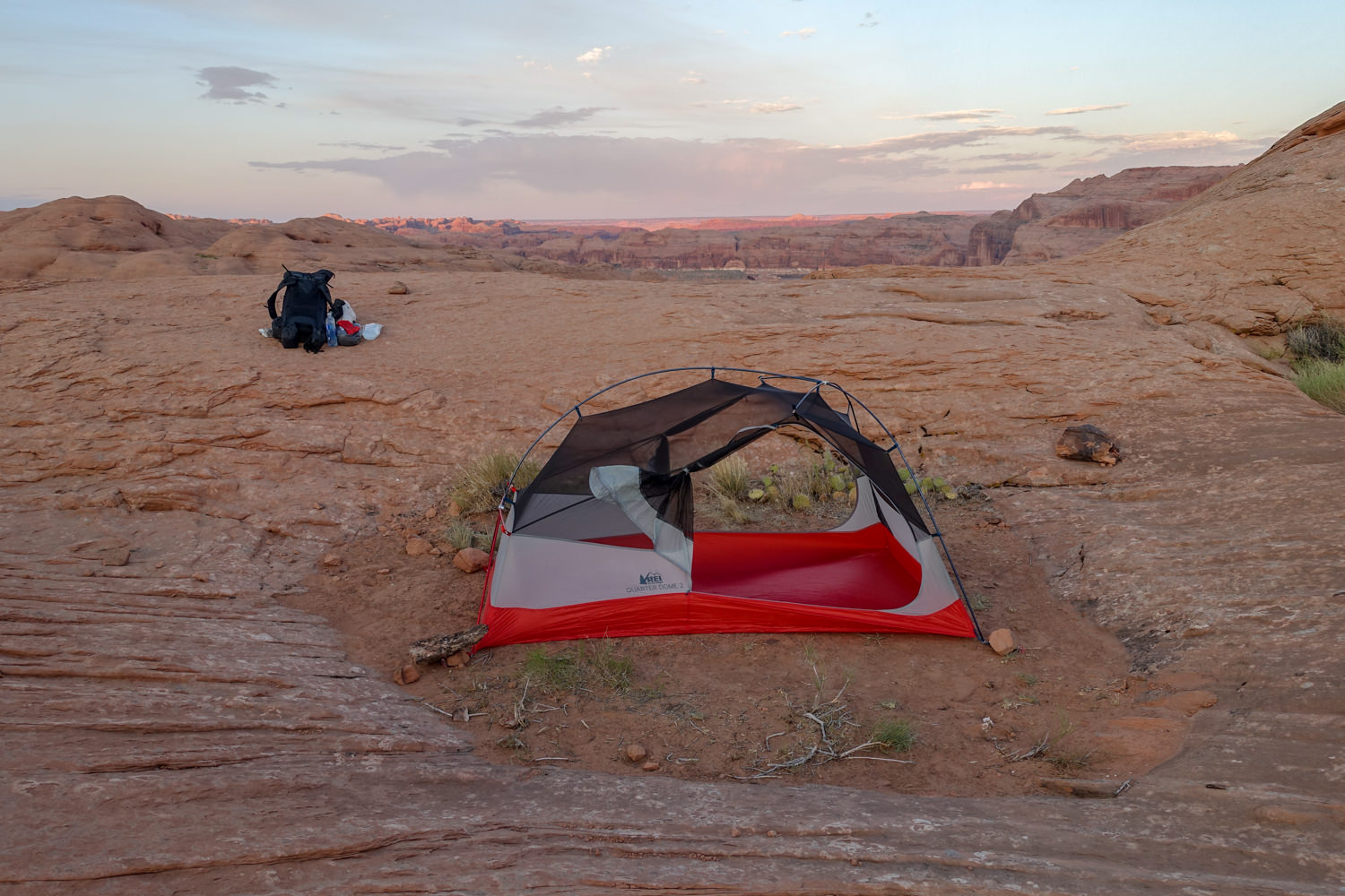 Depending on the time of year, this area can be ideal for cowboy camping (no tent, just a ground sheet). The rock shelf by Reflection Canyon is a good place to sleep under the stars. We brought the REI Co-op Flash 2 on this trip for its lightweight livability and convenience. Check out our list of the best lightweight backpacking tents for our top recommendations.