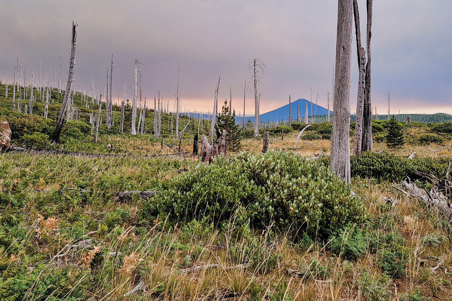 The lack of tree cover lends itself to intense exposure at times, but the stands of white ghost trees are eerie and strikingly beautiful in their own right. The openness due to the lack of brush also makes it possible to see distant views of Mt. Washington, Jefferson, and the Three Sisters for much of the way.